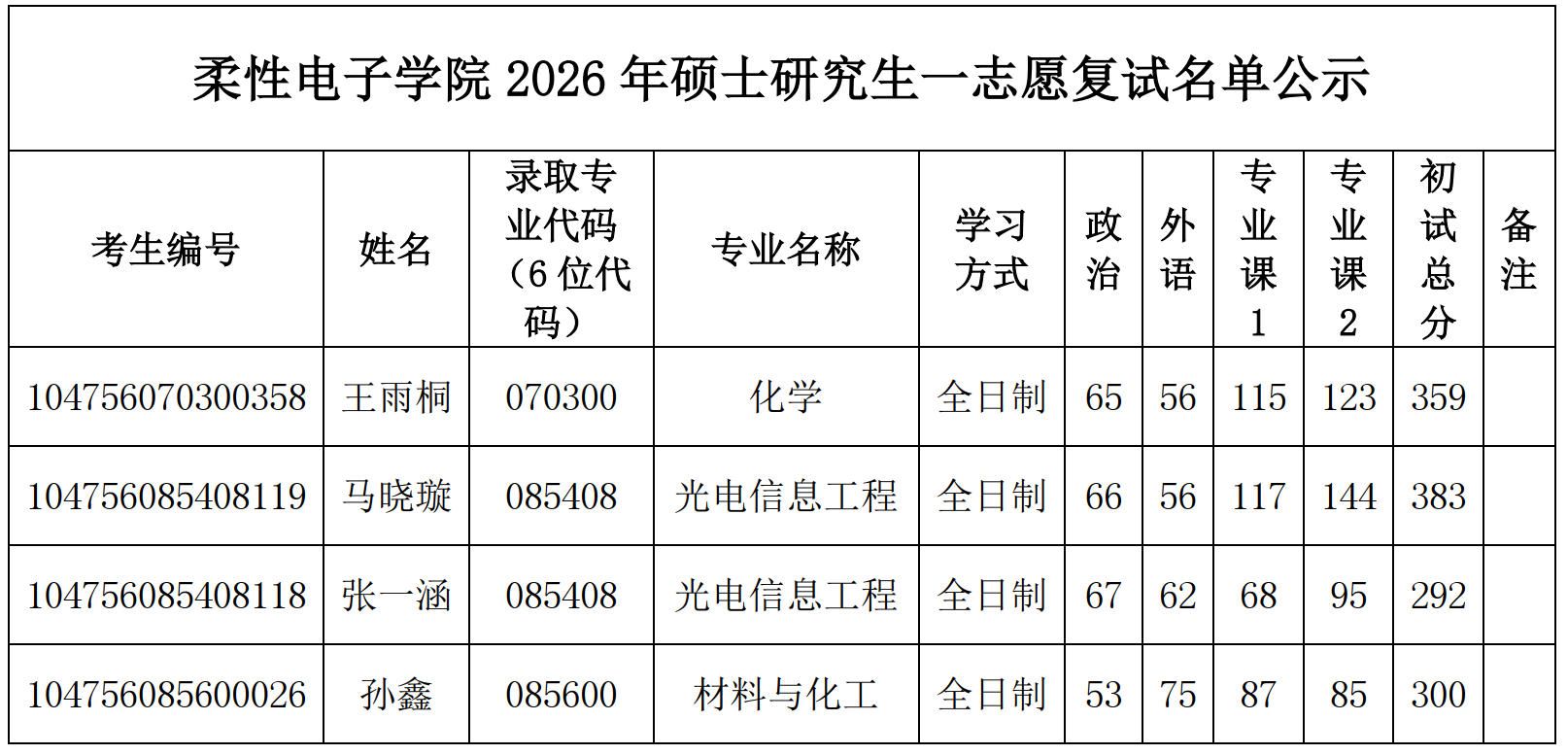 2026年柔性电子学院各招生专业一志愿复试分数线