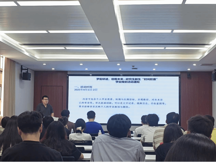 2025年9月4日,我院在九章学堂北组团C座二楼报告厅为2025级研究生新生举行"梦起研途,信载未来"时间胶囊活动。三十余名新生将记录着梦想与期望的信件投入特制的时间信封中,相约三年后毕业时共同开启,见证成长。