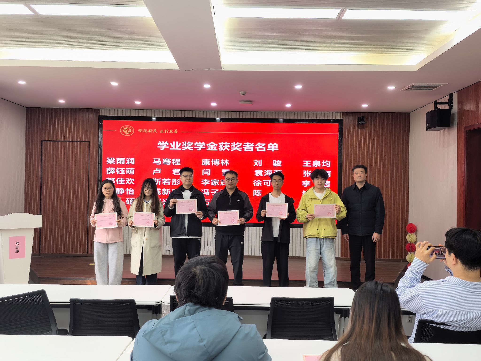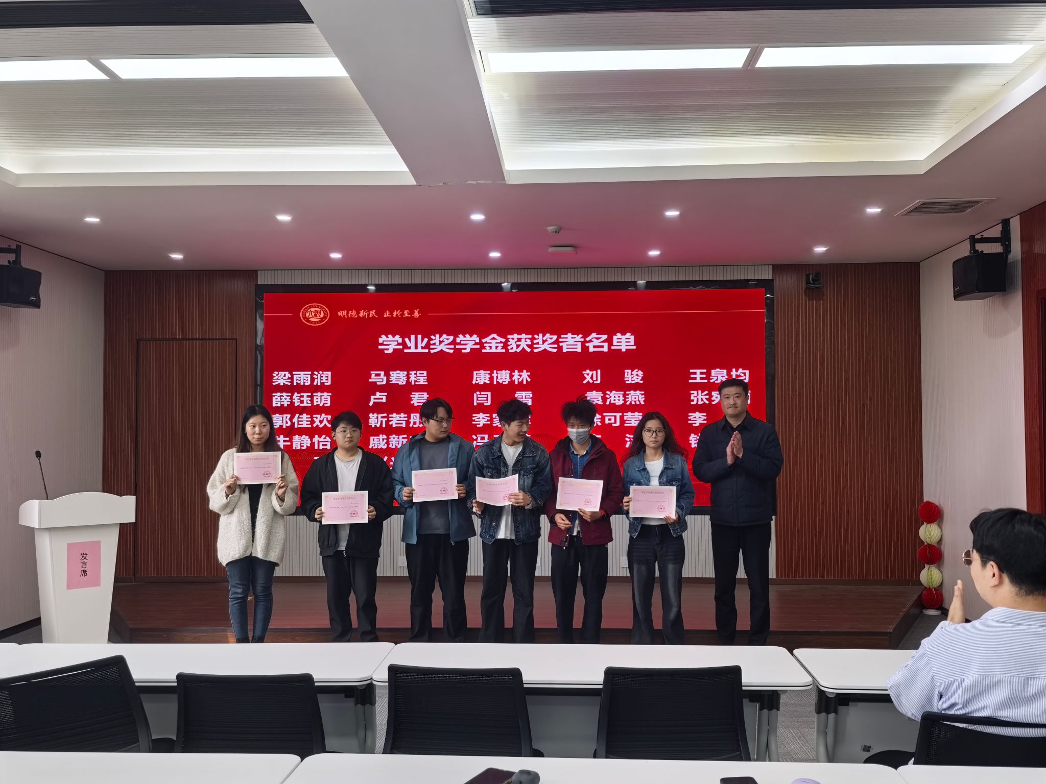 颁奖环节有序开展,董文副书记首先为国家奖学金获得者冯子潇同学颁发荣誉证书,向其表示热烈祝贺。随后,研究生学业奖学金获得者分三组登台,董文副书记为获奖同学逐一颁发证书,并与全体获奖同学合影留念,定格荣耀瞬间,传递奋进力量。